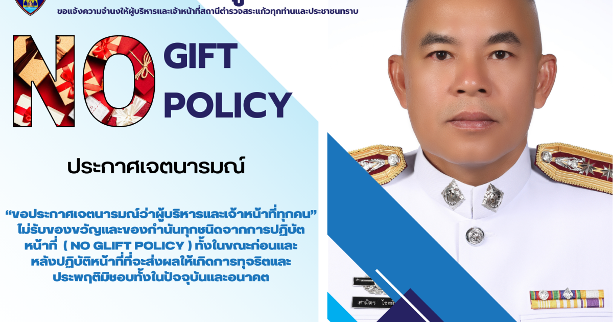 ว่าที่ พ.ต.อ.สามิตร ไชยอิ่นคำ ผกก.สภ.สระแก้ว ขอเชิญชวนข้าราชการตำรวจและพี่น้องประชาชนปฅกิบัติตามมาตรการ เจตนารมณ์ NO GIFT POLICY เพื่อเป็นมาตรฐานในการปฏิบัติหน้าที่และความโปร่งใส่ในการปฏิบยัติหน้าที่ ตามโครงการการประเมินคุณธรรมและความโปร่งใสฯ POLICE ITA