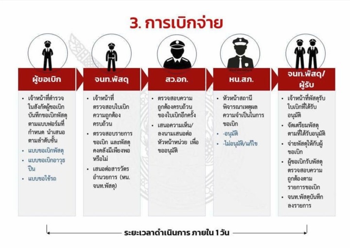 - ตรวจสอบและตรวจนับอาวุธยุทธภัณฑ์ของสถานีตำรวจเพื่อให้มีความพร้อมต่อการใช้งานในภารกิจประจำวัน
